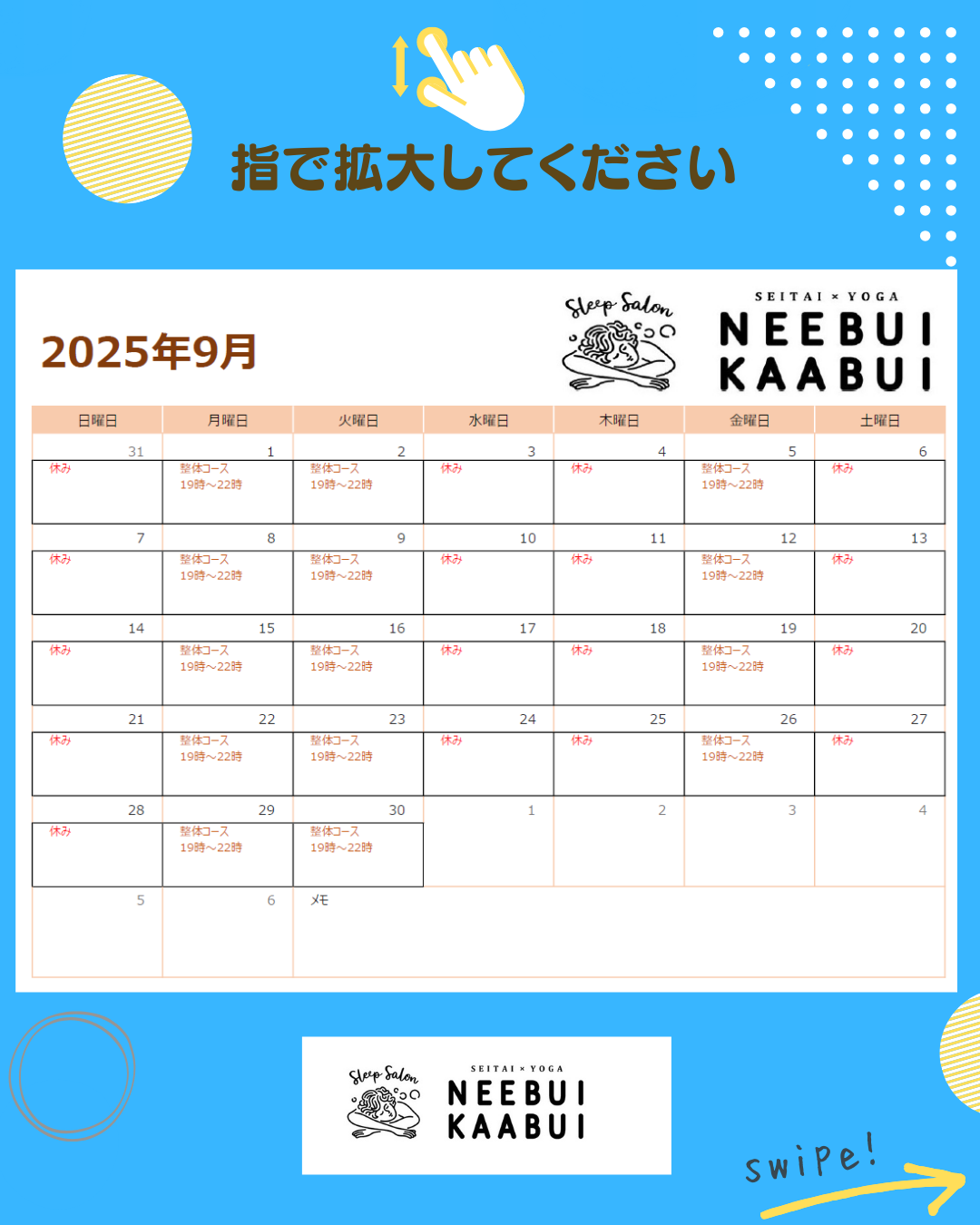 整体部門につきましては、通常通りご予約を承っておりますが、夫婦で営んでおりますため、家庭の事情により急遽キャンセルや日程変更をお願いする場合がございます。